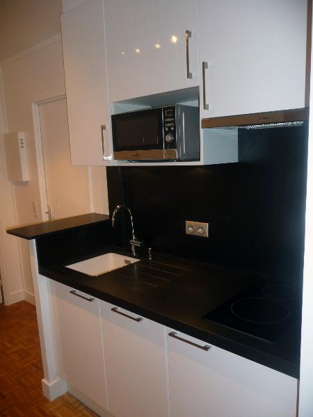 Plan de travail en Granit noir, Réfrigérateur et Lave vaisselle intégrés.