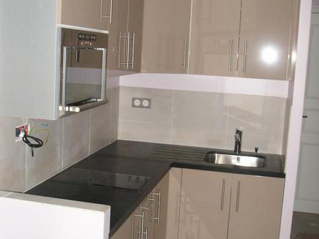 Création d'une cuisine d'angle ouverte sur la salle à manger avec façades de portes serie Capuccino, plan de travail en granit noir adouci 2+2 et électroménager intégrable.