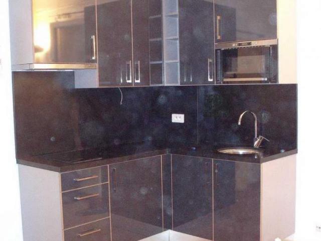 Création d'une cuisine en L ouverte avec facades Ibaneta Anthracite chants multiplis façon boi, plan de travail et crédences en granit noir mat.