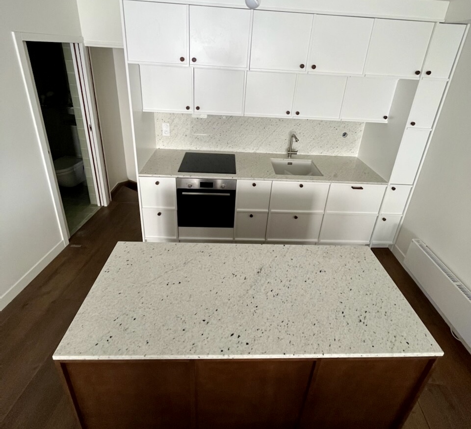 Le plan de travail en granit Pitaya a ensuite été posé avec soin par notre équipe de spécialistes. Chaque détail a été pensé pour s'intégrer parfaitement à l'aménagement existant, alliant esthétique et fonctionnalité.